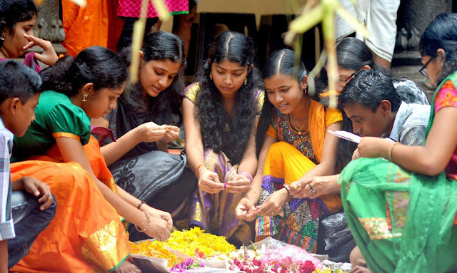 Onappookkalam symbolizes Unity in Diversity, all flowers gather harmoniously. Bloomed flower is a materialization of joy, happiness, accomplished expectations, abundance, plenitude etc. Flowers of various fragrance, colour and quality gather in one pookkalam banishing all discriminations. Jasmine joins Shoe flower, one goes hand in hand with another…. All that facilitate Unity and Integrity, All entwine to envisage Oneness. Different hands from various angles, with different flowers; all converge at one point- all reach one destiny.