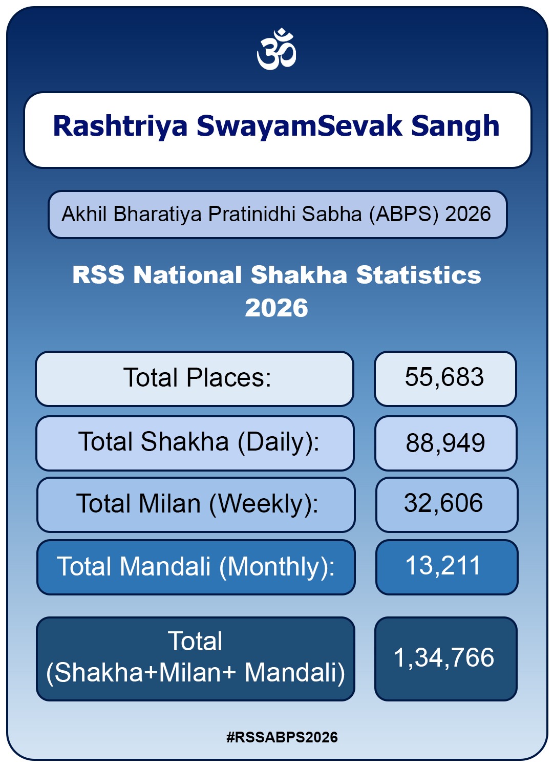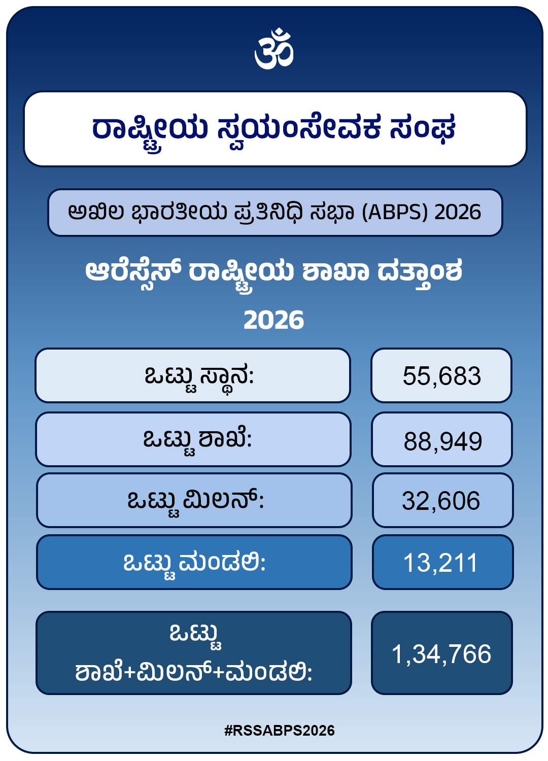 ಆರೆಸ್ಸೆಸ್ ರಾಷ್ಟ್ರೀಯ ಶಾಖಾ ದತ್ತಾಂಶ 2026: ರಾಷ್ಟ್ರೀಯ ಸ್ವಯಂಸೇವಕ ಸಂಘದ ಶಾಖೆಯ ರಾಷ್ಟ್ರೀಯ ದತ್ತಾಂಶದ ಕುರಿತು ತಿಳಿಸಿದ ಸಹಸರಕಾರ್ಯವಾಹರು, ಒಟ್ಟು 55,683 ಸ್ಥಾನಗಳಲ್ಲಿ 88,949 ಶಾಖೆಗಳು ನಡೆಯುತ್ತಿದ್ದು ಕಳೆದ ವರ್ಷಕ್ಕಿಂತ 5820 ಶಾಖೆಗಳು ಹೆಚ್ಚಾಗಿವೆ. ವಾರಕ್ಕೊಮ್ಮೆ ನಡೆಯುವ ಮಿಲನ್ ಸಂಖ್ಯೆ ಕಳೆದ ಬಾರಿಗಿಂತ 459 ಹೆಚ್ಚಾಗಿದ್ದು, ಪ್ರಸ್ತುತ ದೇಶವ್ಯಾಪಿ 32606 ಮಿಲನ್ ಗಳು ಜರುಗುತ್ತಿವೆ. ತಿಂಗಳಿಗೊಮ್ಮೆ ನಡೆಯುವ ಮಂಡಲಿಗಳು ಒಟ್ಟು 13211 ಇವೆ. ಒಟ್ಟು 1,34,766 ಶಾಖೆ, ಮಿಲನ್ ಮತ್ತು ಮಂಡಲಿಗಳು ನಡೆಯುತ್ತಿವೆ ಎಂದು ಮಾಹಿತಿ ನೀಡಿದರು.