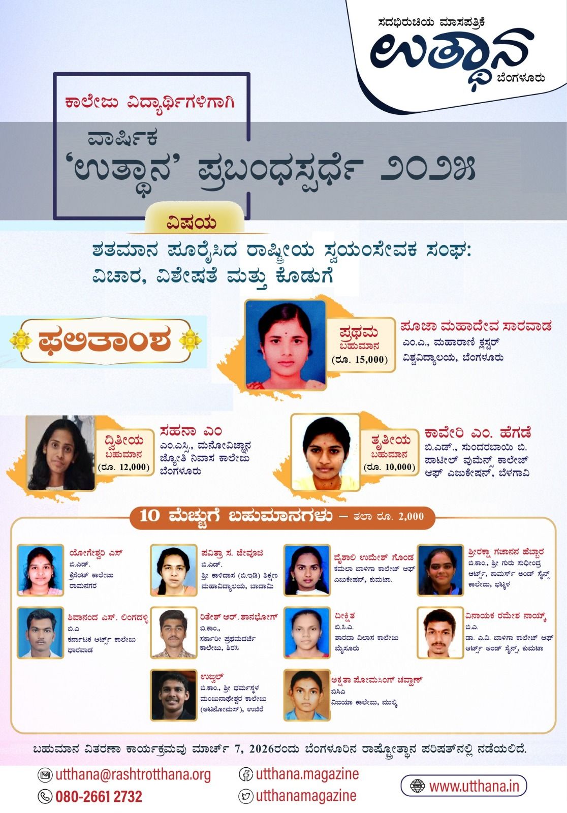 ಉತ್ಥಾನ ಪ್ರಬಂಧ ಸ್ಪರ್ಧೆ 2025 ವಿಜೇತರು: